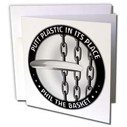 Perkins Designs Disc Golf - Phil The Basket 2 frisbee disc golf putter thrown into the chains of a basket - Greeting Cards-12 Greeting Cards with envelopes Review